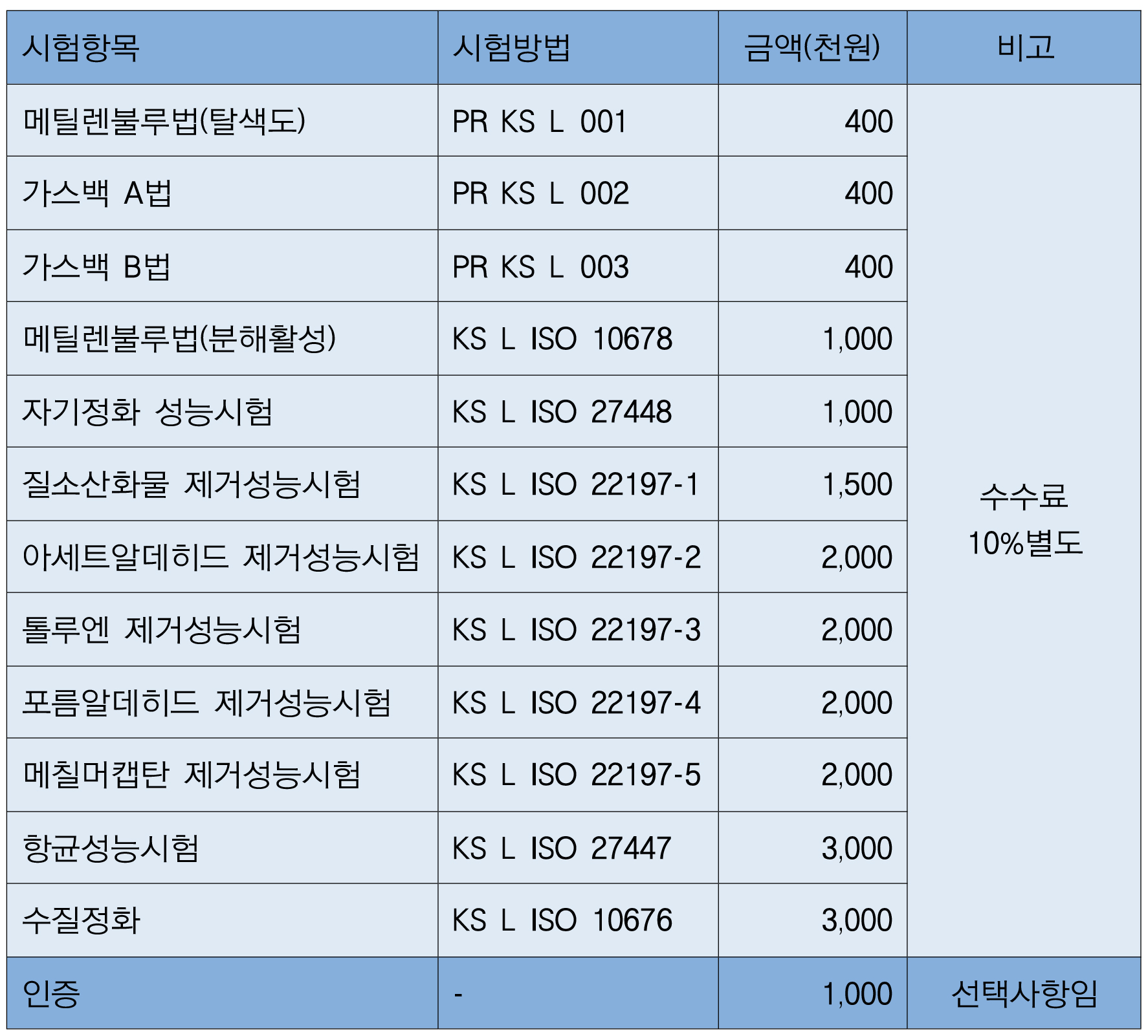 광촉매시험 인증 비용