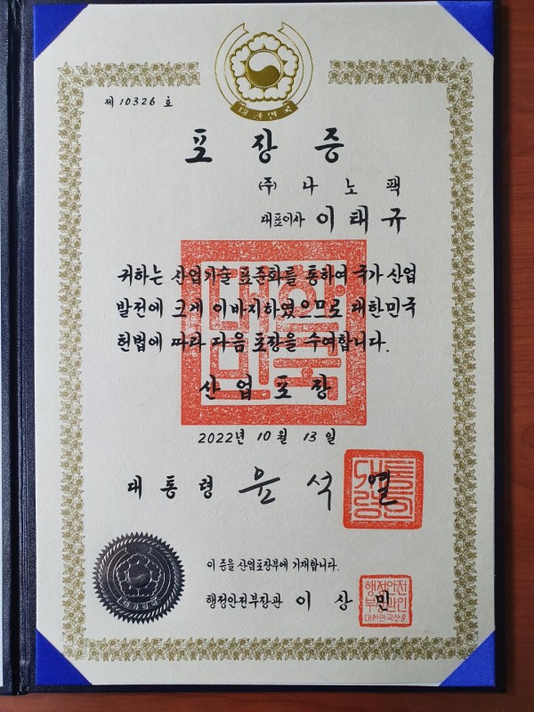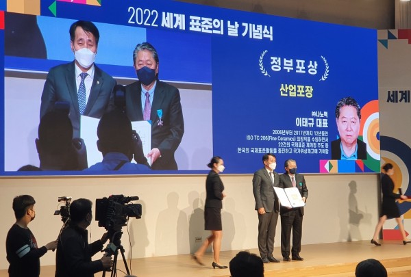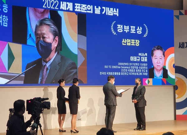 산업포장은 지난 12년간 ISO/TC206 세라믹 소재 분야 의장직을 수임하며 22건의 국제표준 제ㆍ개정을 주도한 이태규 나노팩 대표가 받았다.